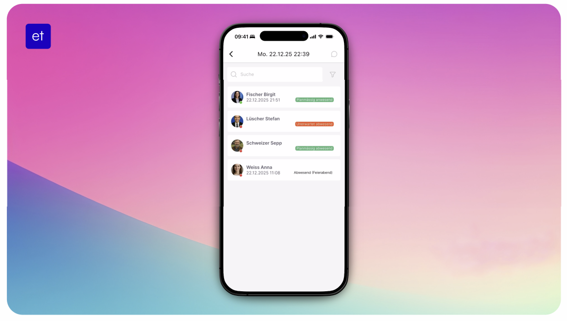 👥 Anwesenheiten in der App prüfenMitarbeitende und Benutzer können in der Eurotime App nun noch schneller und übersichtlicher die Anwesenheiten sowie den aktuellen Status von Kolleginnen und Kollegen einsehen. Live-Stempelstatus Ein klarer Indikator zeigt in Grün oder Rot, ob ein Mitarbeiter aktuell aktiv eingestempelt ist. Zusätzlich gibt der Präsenzstatus detailliert Auskunft darüber, ob ein Mitarbeiter: ✅ Wie geplant anwesend oder abwesend ist ⚠️ Ungeplant anwesend oder abwesend ist ⏳ Noch erwartet wird ⏰ Verspätet ist 🏁 Bereits Dienstende hat 📭 Keine Planung hinterlegt hat ☕ Sich in Pause befindet |