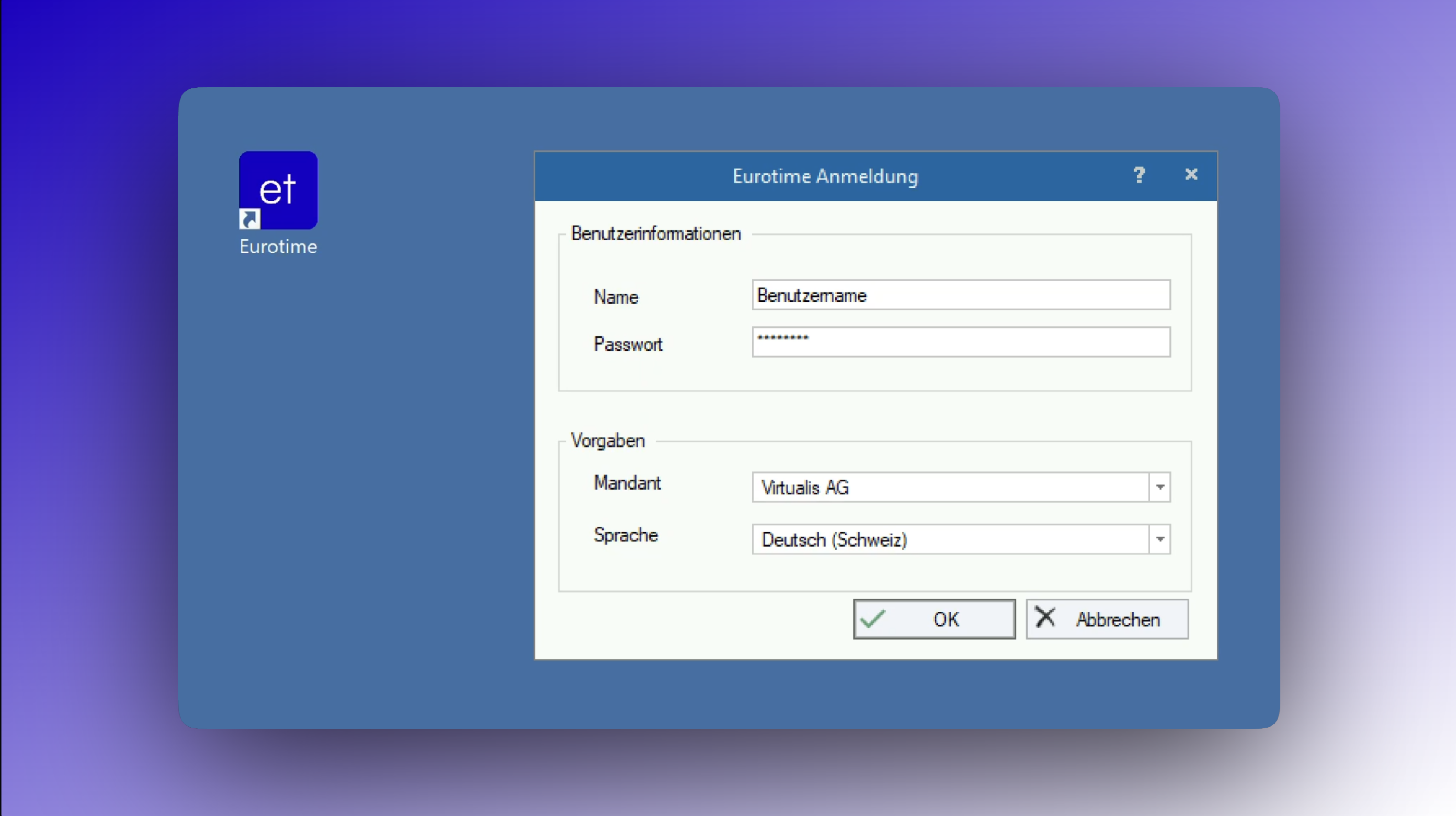 Die Anmeldung ist der Einstieg in Eurotime über die Desktop- bzw. Webversion.