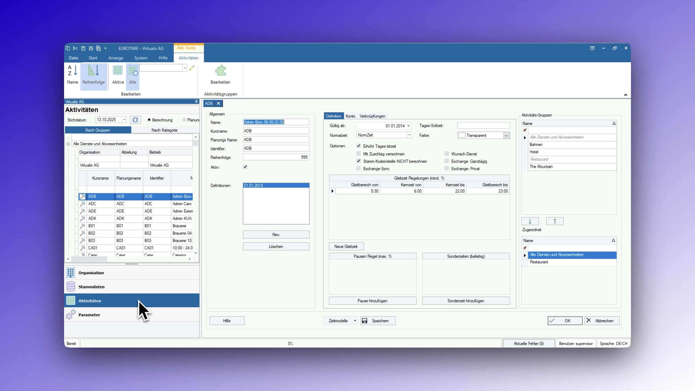 Mit dem Bearbeiten lassen sich Aktivitäten zu Aktivitäts-Gruppen zusammenfassen, respektive einzelne Aktivitäts-Gruppen anzeigen.