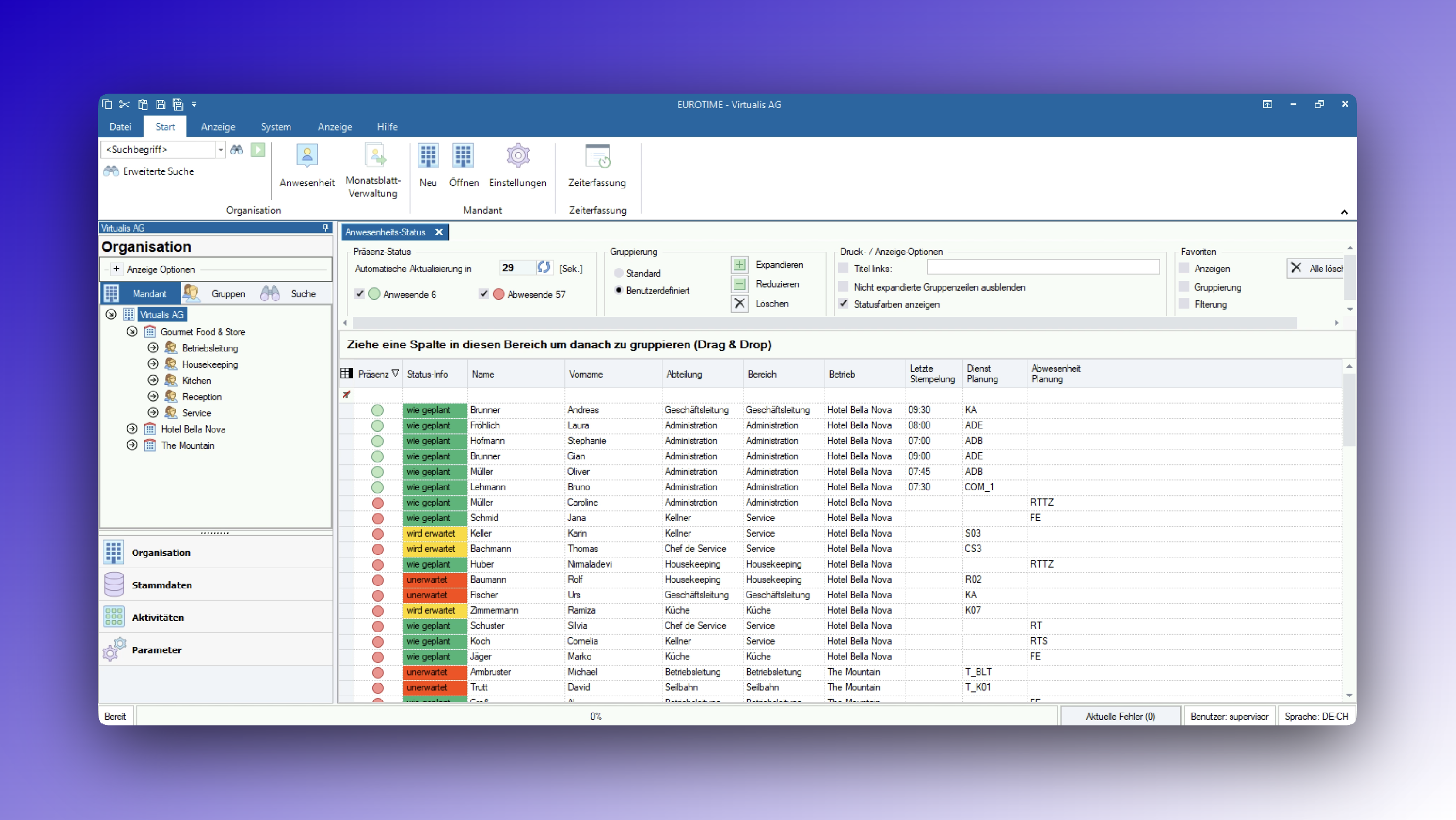 Sofern Sie Anwesenheit gewählt haben und auch über die entsprechende Berechtigung verfügen, können Sie sich einen aktuellen Überblick über anwesende, respektive abwesende Mitarbeiter und Mitarbeiterinnen anzeigen lassen.